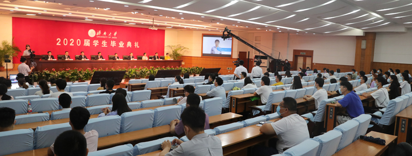 典礼在奏唱国歌中开始,副校长陈月辉宣读了2020届毕业生学位授予决定;副校长王志宣读了2020届优秀毕业生表彰决定;党委书记徐景颜为2020届优秀毕业生代表颁发荣誉证书及纪念品;毕业生代表、政法学院社保1602班学生纪君婷以及化学化工学院张晴晴、商学院孙伟强、数学科学学院仲崇欣、外国语学院徐佳萌、水利与环境学院丁祥伟、美术与设计学院马翔天、音乐学院赵华葳、信息科学与工程学院王浩浩、化学化工学院高超民、材料科学与工程学院刘浩10位在线学生发言;21个学院的教师代表送上祝福;校友代表、山东威高新生医疗器械有限公司副总经理吕汝举发言;校长张士强讲话。
