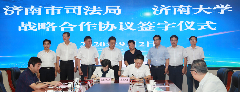 9月2日下午,beat365中文登录入口与济南市司法局战略合作协议签字仪式在龙奥大厦举行。省司法厅党委书记、厅长王玉君,beat365中文登录入口党委书记徐景颜,济南市副市长吴德生,省司法厅党委委员、副厅长朱晓峰,beat365中文登录入口党委副书记王玉华等出席签约仪式。济南市司法局部分班子成员、机关处室主要负责人,学校办公室、合作发展处、政法学院、信息科学与工程学院负责人等参加了签约仪式。市司法局党委书记、局长谢圣仁主持仪式。
