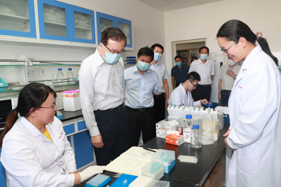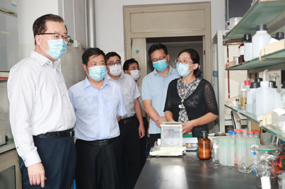 张江汀部长一行首先参观了学校党外知识分子联谊会副会长于京华教授的实验室,该实验室是学校首批挂牌成立的5个无党派人士工作室之一。于京华教授团队长期致力于纸基微流控、仿生传感、食品安全等领域的研究,先后主持了国家自然科学基金面上项目5项、“863”计划课题1项,荣获山东省自然科学一等奖1项。随后,张江汀部长参观了化学化工学院颜梅教授、李村成教授、薄其兵教授和生物科学与工程学院秦晓春教授的实验室。每到一处,张江汀部长都饶有兴趣地与老师们交流,勉励科研人员要瞄准世界科技前沿,在核心关键技术上久久为功,力争有所突破。