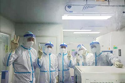 在核酸检测实验室,由医院、冯潍老师和生科院老师组成的核酸检测组优化检测流程,为快出结果抢时间,担任二区提取任务的人员,着三级防护套装,在二区需连续奋战4个小时,每天要完成3-4批次样本检测,防护服里留下的汗水、脸上口罩和帽子留下的勒痕见证了组员们的艰辛。这种为了师生忘我奉献的精神,充分诠释了以学生为本的大爱情怀。