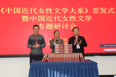 张士强向参会领导和专家简要介绍了学校的情况,对《中国近代女性文学大系》的出版表示祝贺,对组织和参与《大系》工程的郭延礼教授和各方人员表示感谢。杨宗杰副主席、郭延礼教授、昝亮社长、黄霖教授、关爱和教授、杜泽逊教授、孙之梅教授分别讲话,对《中国近代女性文学大系》的出版发行表示祝贺,对《大系》的学术价值和意义给予高度评价。杜泽逊说,《中国近代女性文学大系》是由学术名家主导、专业学者分工合作、规模宏大、学术质量上乘的近代女性文学作品和理论的集成性成果,也是中国近代文献整理的具有里程碑意义的丰硕成果;马卫中用“神化所之,体大虑周”概括《大系》的成就;黄霖说《大系》是“中国近代文学研究史上的一座丰碑”;袁进说,《中国近代女性文学大系》的问世,不仅是对近代女性文学研究的推动,也是对整个中国文学史女性文学研究的推动。会议举行了《中国近代女性文学大系》首发仪式,张士强校长、郭延礼教授、昝亮社长共同为《大系》揭牌。首发式后,参会专家学者围绕《中国近代女性文学大系》以及中国近代女性文学研究等问题展开了充分、深入的研讨交流。