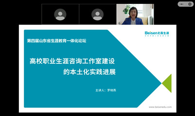 北森生涯咨询产品总监罗晓燕作《高校职业生涯咨询工作室建设的本土化实践进展》经验分享,她基于生涯教育政策导向变化,围绕生涯咨询室本土化的实践调研和本土化解决方案两大板块进行了详细介绍,提出了包括基础建设、师资培养、运营管理、资源统筹的咨询室建设常规过程和各阶段的典型特征,为进一步建设有特色的职业生涯咨询工作室提供了科学的方法和思路。beat365中文登录入口学生生涯发展指导中心主任张晶作《基于在校经历的大学生生涯规划指导模式——以beat365中文登录入口为例》的经验分享,他结合生动鲜活的实践案例提出“在校经历”的重要性,以学生工作实践为依据提出在校经历的类别划分、发展维度和打造途径,引出目标驱动(经典生涯规划框架)、任务驱动(生涯发展五阶段)、方向驱动(生涯模式四分类)三大生涯发展建构模式,并分享基于“在校经历”的生涯指导方法和工作领域,为学生生涯发展指导提供了新的视角。山东省实验中学东校升学指导中心主任高良元作《以生涯教育为抓手助推学生多元发展》的报告,他从高中生涯教育课程建设、生涯指导课程活动体系、相关的探讨与需求等三个方面介绍了多元化促进高中学生生涯发展的工作思路、具体做法和实践经验,是新高考改革之后实现高高(高中-高校)衔接的有效途径。青岛大学学生生涯发展指导中心主任李莹分享《“以学生为中心”—高校生涯教育心得》,李老师围绕“以学生为中心”的核心目标,从对学生可操作、有实效的内容建设到让学生喜欢听、愿意用的呈现形式,介绍了学校的实践经验和特色做法,提出了学校的1234+生涯规划与就业指导工作体系,为高校生涯课程建设提供了新思路。山东中医药大学招生就业处副处长、大学生就业指导中心主任刘同国作《高质量培训,精准化指导,推进宏志助航计划顺利实施》的报告,他围绕宏志助航计划和工作实际,详细介绍了“四到位”组织高质量培训,“四抓实”开展精准化指导的培训模式,并课程内容体系、培训组织、资源整合等方面提供了科学性建议。