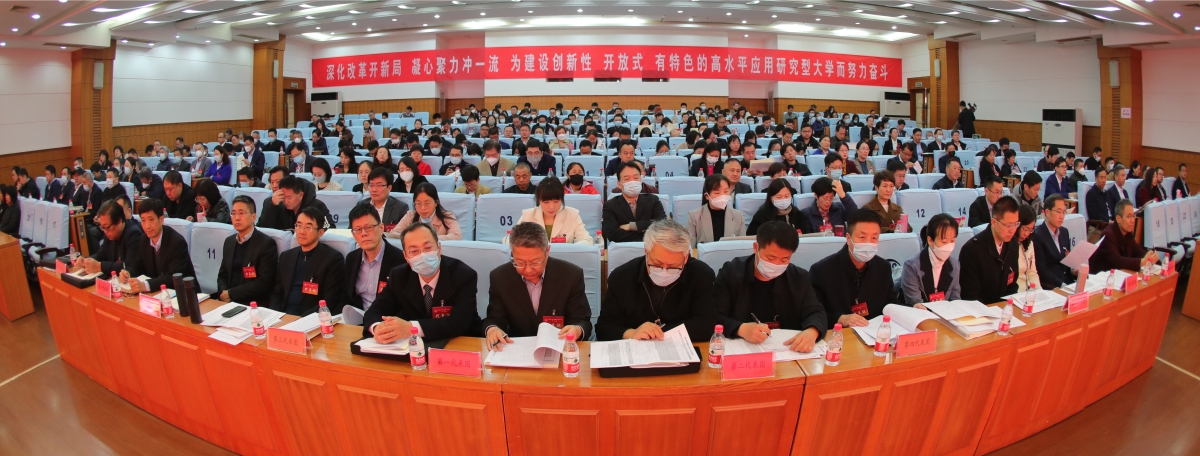 本次会议的主题是:以习近平新时代中国特色社会主义思想为指导,贯彻落实党的二十大和二十届二中全会精神,在总结第四届教代会工作的基础上,紧紧围绕学校第四次党代会确定的“一二三”发展思路和“四五六”战略部署,团结全校教职工,立足新起点,勇担新使命,展现新作为,为建设创新性、开放式、有特色的高水平应用研究型大学努力奋斗。