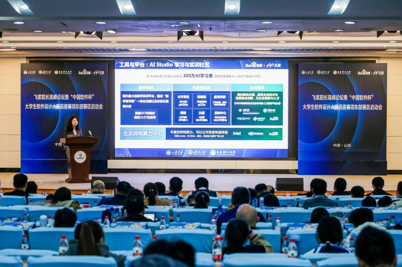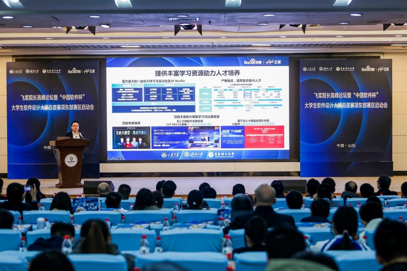 随后,青岛理工大学副校长王在泉、山东大学团委书记姜炳刚分别致辞介绍学校的基本情况,并表达对本次活动的高度关注以及对本次活动顺利开展的美好愿景。百度AI技术生态总经理马艳军博士和山东大学数学与统计学院副院长兼山东大学数据科学研究院副院长郭亮教授、百度飞桨教育生态运营负责人钱芳分别以《“深度学习平台+大模型”产业智能化基座》《校企融合,共探AI+X微专业人才培养新模式》《飞桨人工智能人才培养及2023年规划》为题作专题报告。