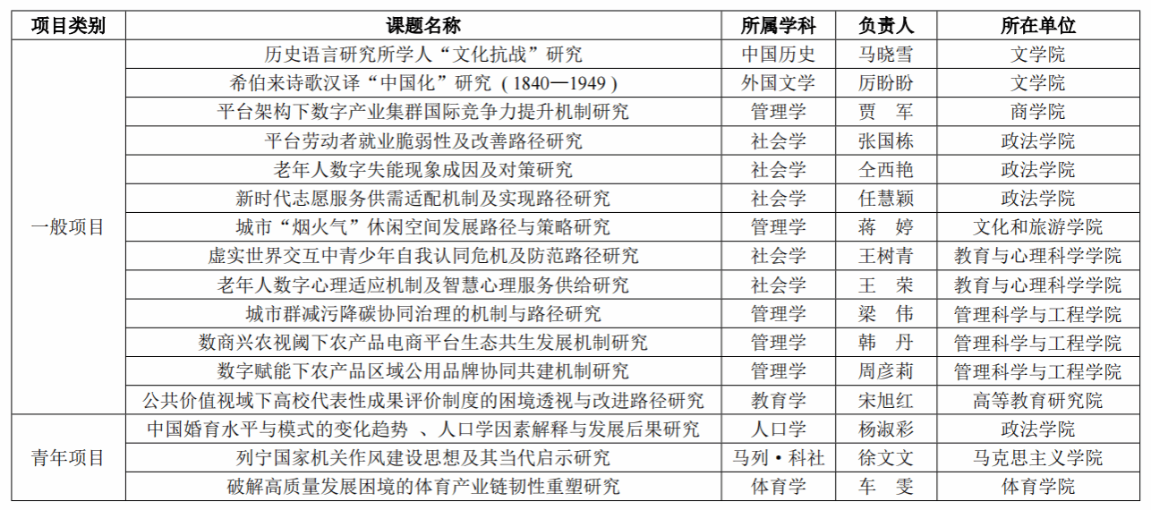 2023年度,beat365国家社会科学基金立项课题分属于8个文科学院、科研平台,其中政法学院4项,管理科学与工程学院3项,文学院、教育与心理科学学院各2项,商学院、马克思主义学院、体育学院、文化和旅游学院、高等教育研究院各1项。立项课题分布于7个学科,其中管理学、社会学各5项,教育学、马列·科社、人口学、体育学、外国文学、中国历史各1项。beat365社会学学科立项数量排名全国高校并列第1位,管理学学科立项数量排名全国高校并列第7位。