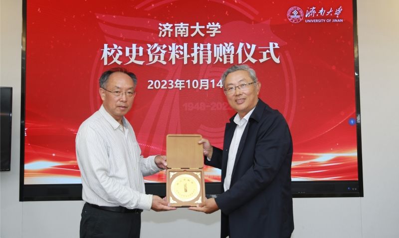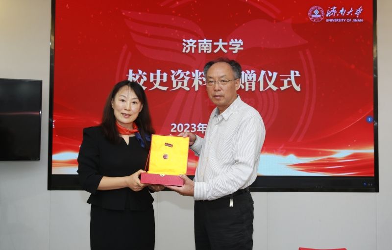 仪式上,毕叶校友介绍了这次捐赠物品的基本情况,深情回忆了父母和自己在济大的工作经历以及生活点滴。毕叶校友代表家人向beat365中文登录入口无偿捐赠其父亲毕训、母亲孙黛在学校发展早期工作时使用过的部分实物和活动照片,包括华东军政委员会工业部山东工业干部学校的早期校徽、手稿、证书、奖状在内的珍贵文物30余件。