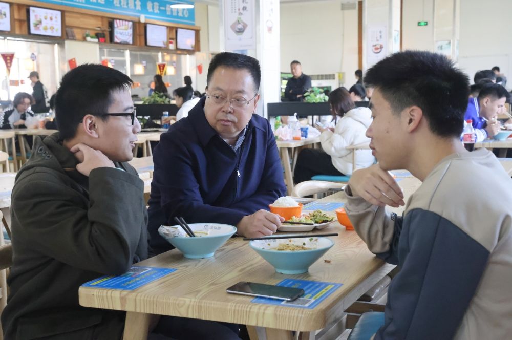 中午,刘宗明在食堂与学生一同用餐,认真听取了同学们对食堂饭菜质量、价格及服务方面的意见和建议,详细询问他们的学习、生活情况,勉励同学们厚植家国情怀、涵养进取品格,以奋斗姿态激扬青春,不负时代,不负华年。