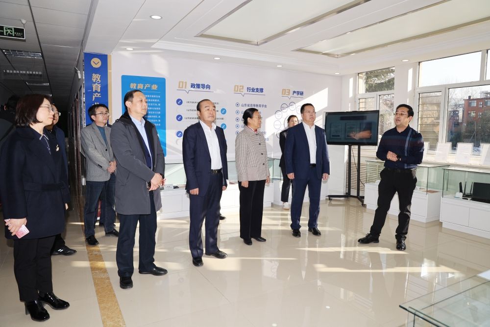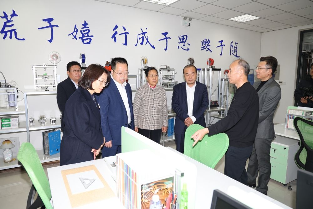 调研组实地走访创新创业学院,全面考察园区运营情况及相关政策措施实施情况,详细了解近年来学校在创新创业领域取得的成效;参观了入驻孵化企业齐鲁现代教育文化集团、beat365中文登录入口广可文物保护创新研究院和易构实验室;现场听取团委书记胡春毅对学院发展历程、规划建设、发展理念、取得成果的汇报。