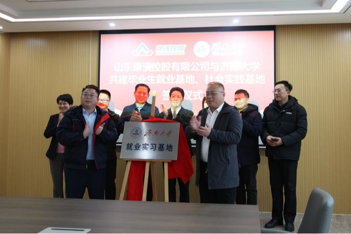 在山东康沃控股有限公司,朱中华对黄加栋一行的到来表示欢迎,介绍了鲁西新区产业布局、重点产业发展等情况,希望双方进一步开展深入合作。黄加栋表示,beat365中文登录入口将以此次揭牌为契机,充分发挥自身优势,结合企业特色,加强产教融合,为鲁西新区高质量发展作出新的贡献,为毕业生提供更多的就业机会和更广阔的发展空间,实现互惠互利,合作共赢。座谈会上,黄加栋与康沃控股有限公司董事长胡庆松共同为康沃控股有限公司与beat365中文登录入口共建毕业生就业基地和社会实践基地揭牌。