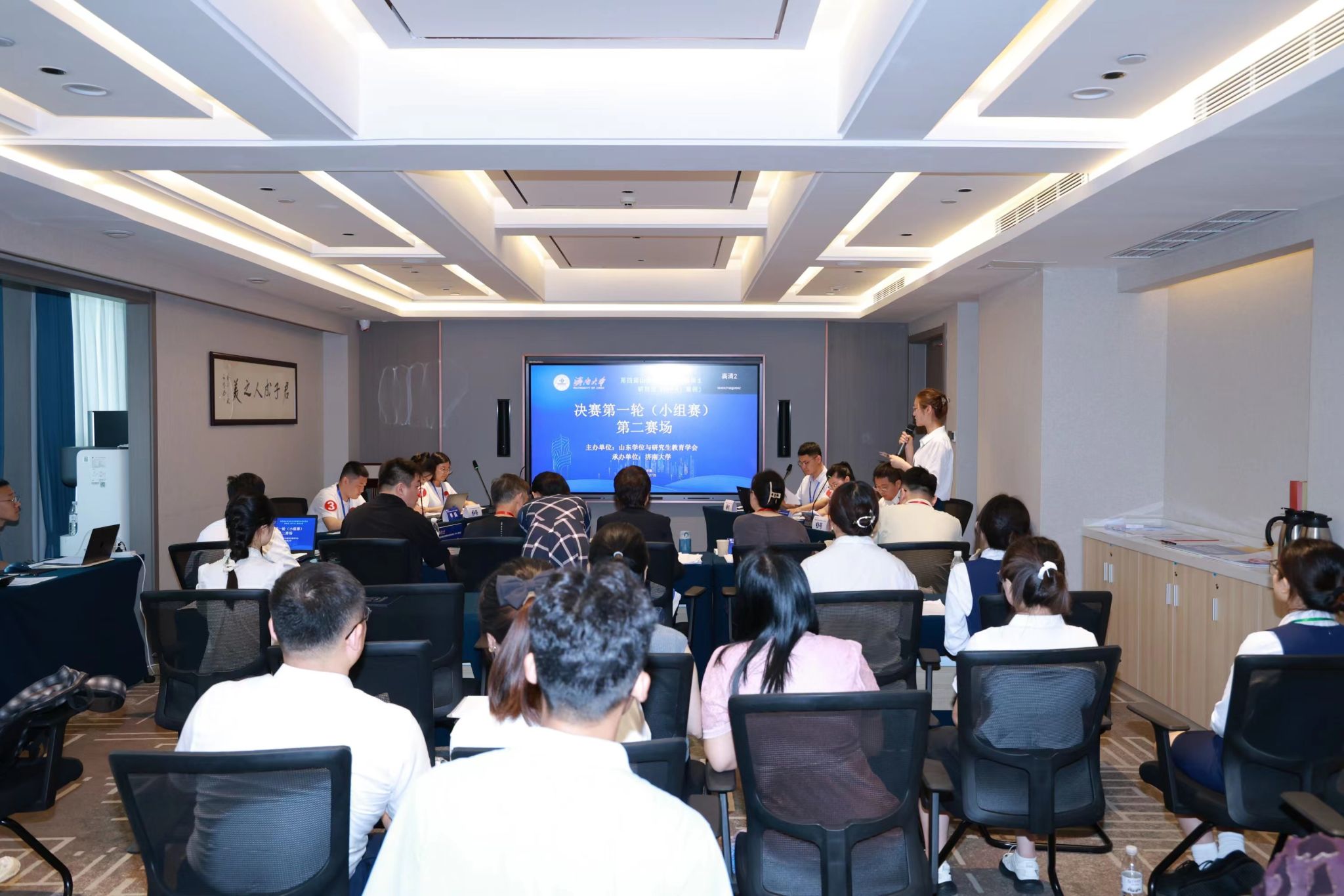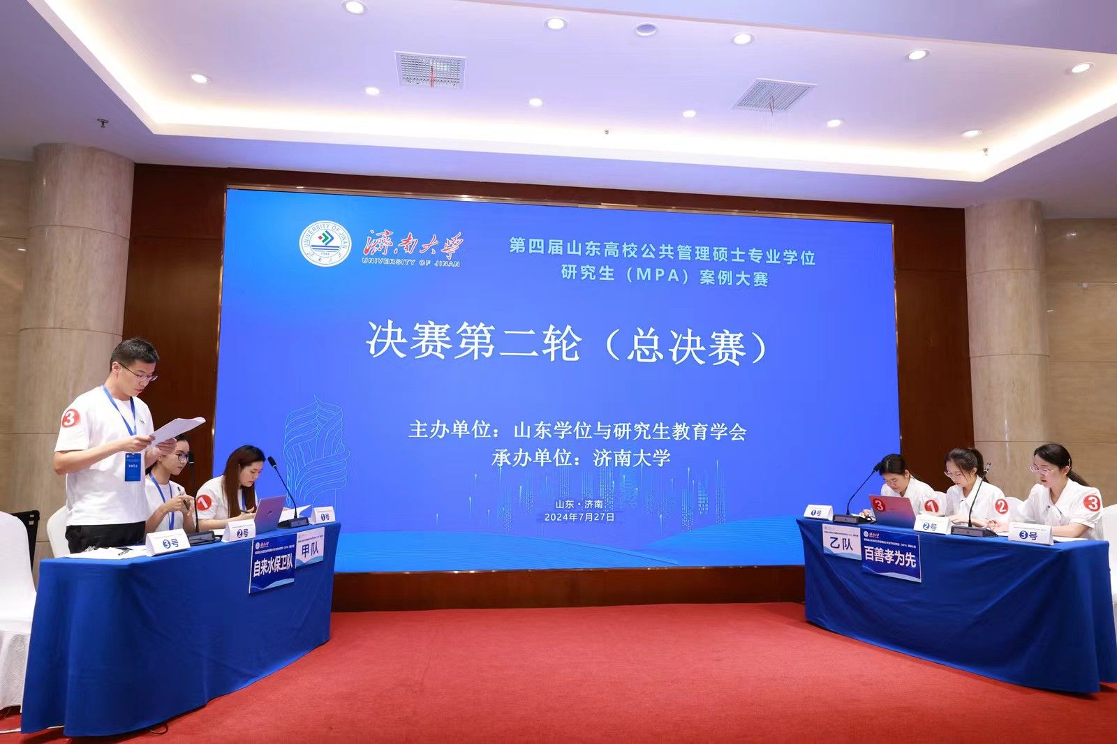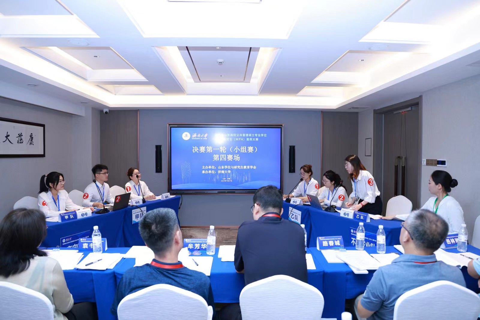 决赛分为小组赛和总决赛两个环节。7月27日上午为小组赛,分为四个赛场同时进行。24支参赛队伍通过抽签确定赛场和对手,每个赛场6支队伍、两两对决。比赛双方现场展示案例正文及分析报告,并进行自由辩论、总结陈述。评委根据每支队伍的案例采编及分析质量、专业水平和比赛表现进行现场评分。经过一上午的激烈比赛,来自山东大学、山东师范大学、曲阜师范大学和beat365中文登录入口的4支队伍进入大赛总决赛,共同角逐特等奖和一等奖。