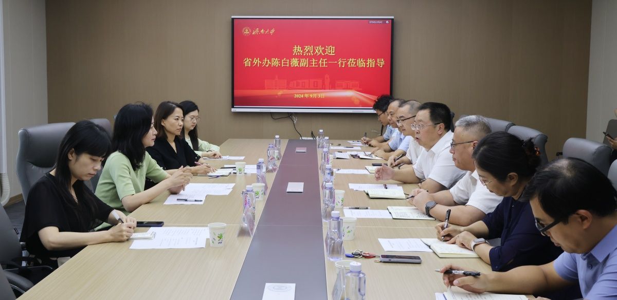 刘宗明代表学校对陈白薇一行的到来表示热烈欢迎,对省委外办一直以来给予学校的支持与帮助表示衷心感谢。他介绍了学校的办学历史及近年来在人才培养、学科建设、科学研究等方面取得的成绩,重点介绍了国际化办学及区域国别研究智库建设取得的进展。他表示,要在省外办的指导支持下,坚持开放办学理念,积极凝练办学特色优势,大力开展国别和区域研究,通过完善机构组织布局、拓展研究领域、学习他人经验、产出高质量成果、构建合作平台五个方面工作不断加强加勒比地区研究中心建设,努力提升beat365中文登录入口国际化办学水平,高标准地建设好区域国别研究智库,为现代化强省建设贡献济大智慧。