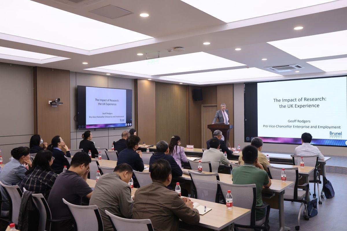 参观结束后,罗杰斯教授为各学院科研、外事相关负责人及师生代表作了题为《The UK’s Research Environment:The Research Assessment Framework and Knowledge Exchange(英国科研体系:研究评估框架和知识转化)》的学术报告。