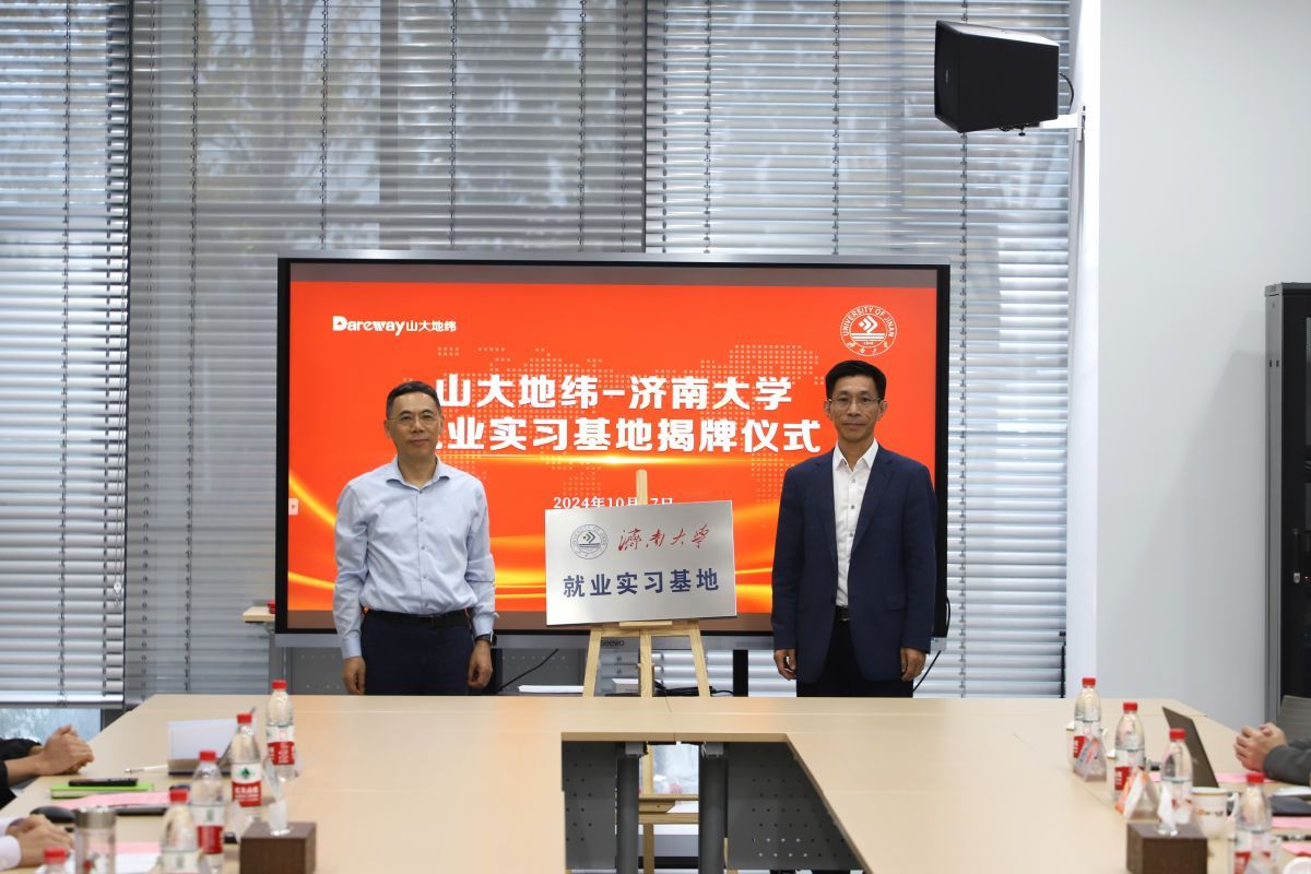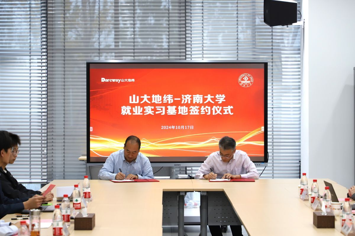 签约仪式上,beat365中文登录入口党委学生工作部(处)副部(处)长董俊杰代表学校与山大地纬软件股份有限公司副总裁徐喆签订《毕业生就业实习基地协议》,李强和李庆忠共同为“beat365中文登录入口就业实习基地”揭牌。