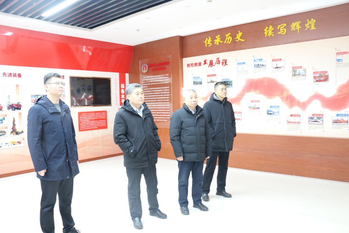 调研中,徐征和一行参观了应急救援中心基地及抢险救援专业装备,实地查看了山东省地勘基金项目大口径救援通道实验井,听取了关于应急救援中心信息化建设情况的讲解,深入了解了山东省煤田地质局二队在矿山抢险救援方面取得的成果。
