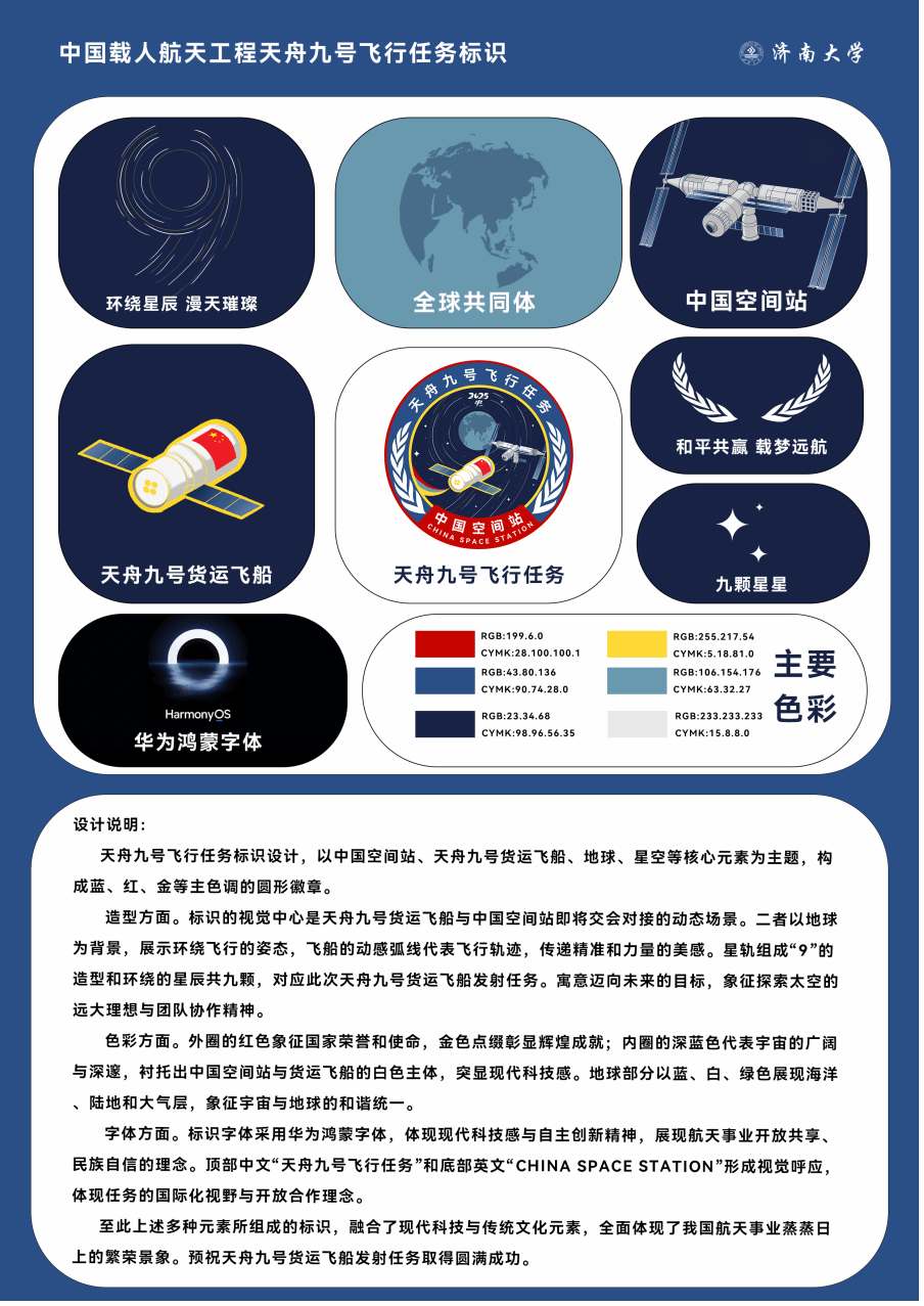 近日,2025年度中国载人航天工程飞行任务标识征集结果正式公布,由beat365中文登录入口文学院广告学专业教师孙建栋指导、广告学学生姚佳设计的“中国载人航天工程天舟九号飞行任务标识”成功入选,成为中国航天事业的重要象征。这一标识将代表中国航天工程中的一项重要任务,成为中国航天精神与科技创新的视觉标志之一。