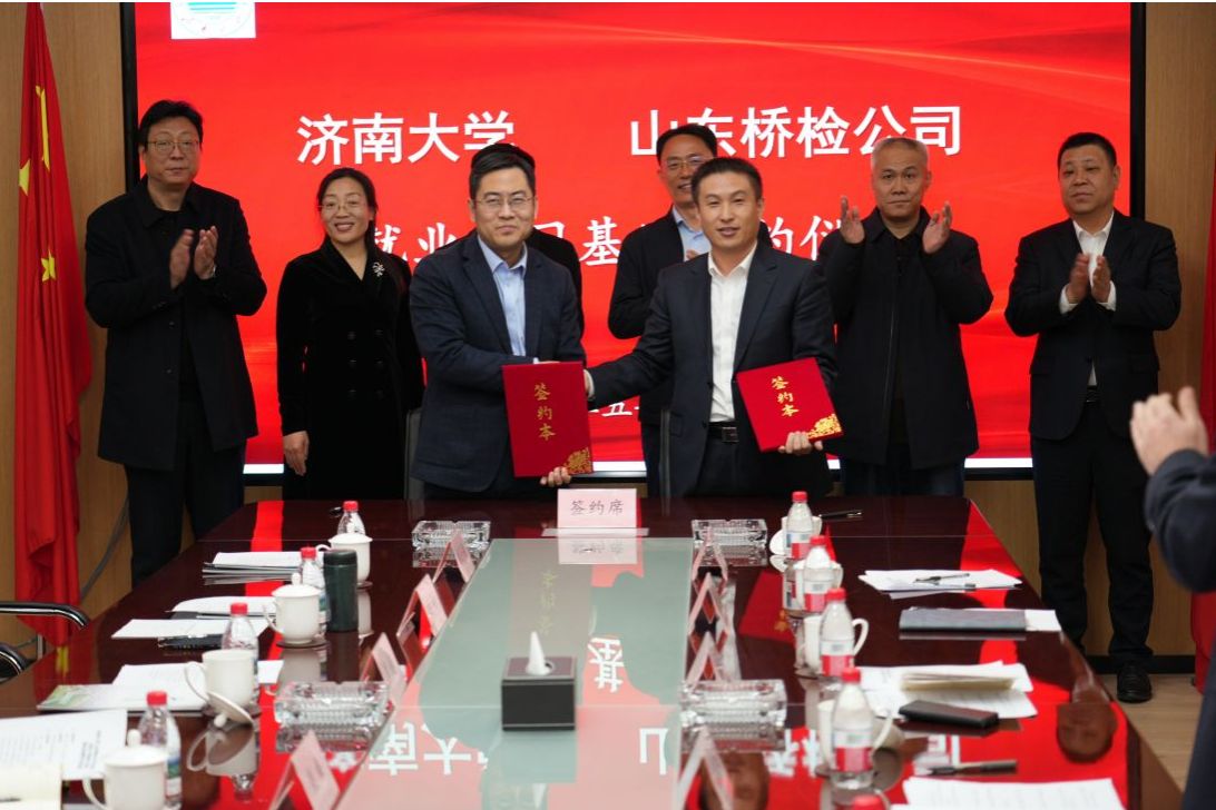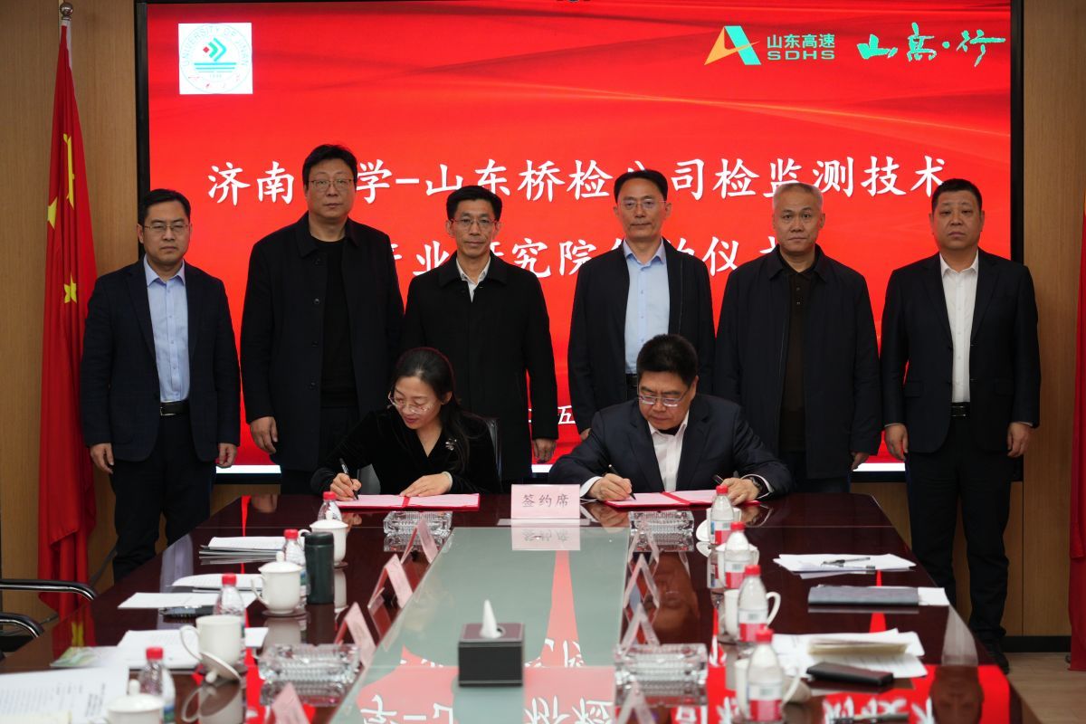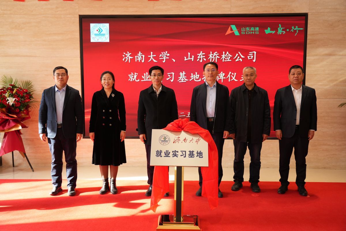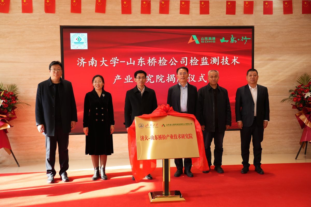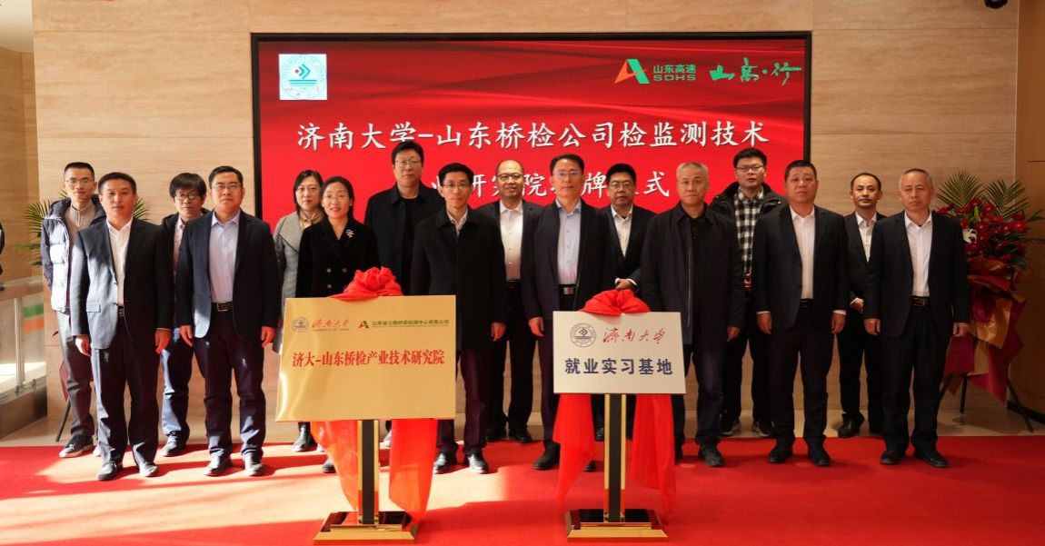 2月13日下午,beat365中文登录入口与山东省公路桥梁检测中心有限公司共建的“检监测技术产业研究院”与“beat365中文登录入口就业实习基地”揭牌仪式在山东高速工程咨询集团有限公司举行。beat365中文登录入口党委常委、副校长李强,山东高速集团党委常委、副总经理李怀峰,山东高速工程咨询集团有限公司党委书记、董事长张平,山东省交通运输厅工程建设事务中心质量部部长孙吉勇,山东省公路桥梁检测中心有限公司党支部书记、董事长高庆水出席仪式。学校科技处、土木建筑学院以及企业相关部门负责人参加活动。仪式由山东高速工程咨询集团有限公司党委委员、副总经理单煜辉主持。