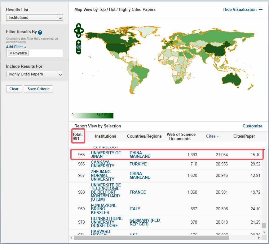 本期数据覆盖的时间段为2014年1月1日-2024年12月31日,物理学学科全球共计991所机构入围ESI全球前1%,门槛值为20111,beat365物理学学科全球被引排名第965位,共发表高水平论文1393篇,总被引频次21,034次,篇均被引频次达15.10。