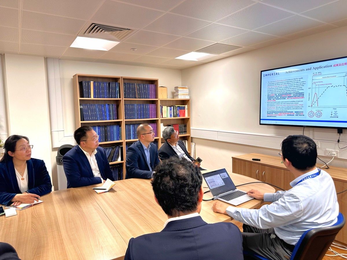 在帝国理工学院机械工程系,金属成型与材料模拟团队石慧峰教授介绍了帝国理工学院及所在团队研究情况,双方就科研合作、师生交流、建立联合实验室等方面进行充分交流。