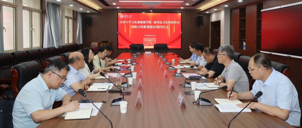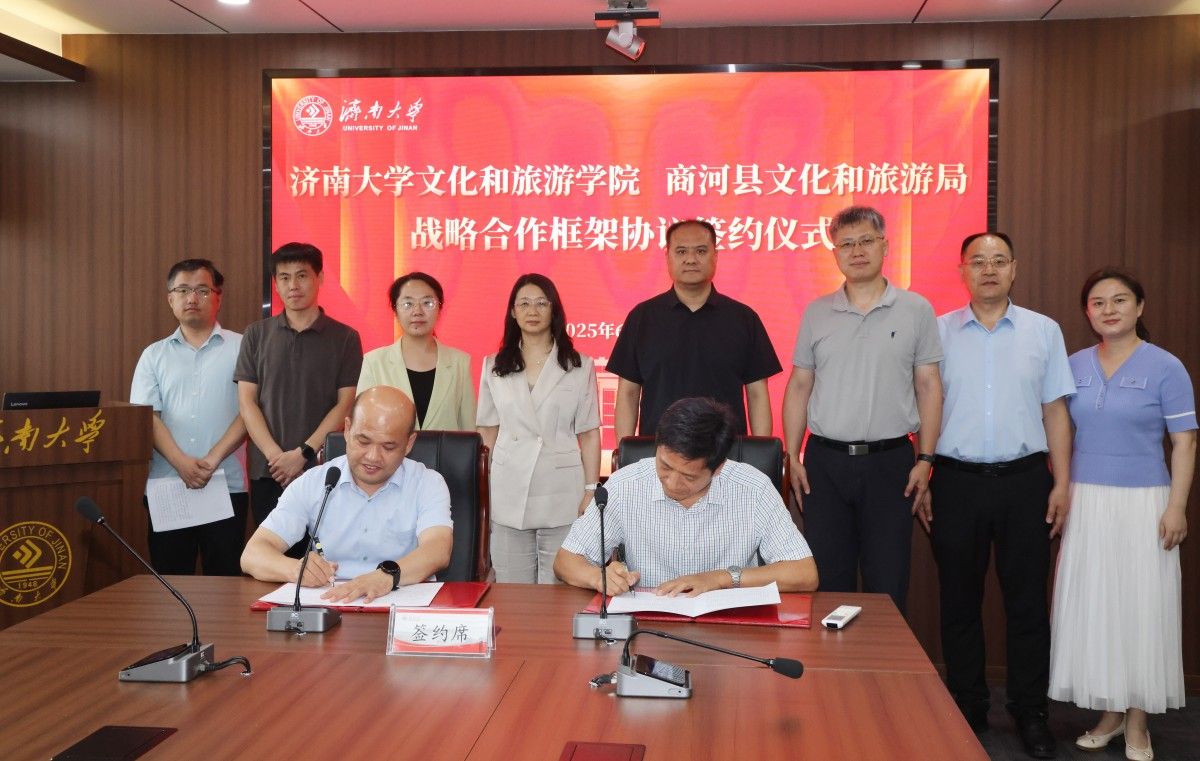 会上,文化和旅游学院党委书记孟德洋与商河县文化和旅游局局长刘长清代表双方签订了战略合作框架协议。刘长清针对商河县文化和旅游发展情况进行了专题宣讲。双方还就合作开发文创产品、旅游项目设计、品牌培育、创新课题研究、非遗创新传承等方面进行了交流和讨论,达成多项合作意向。