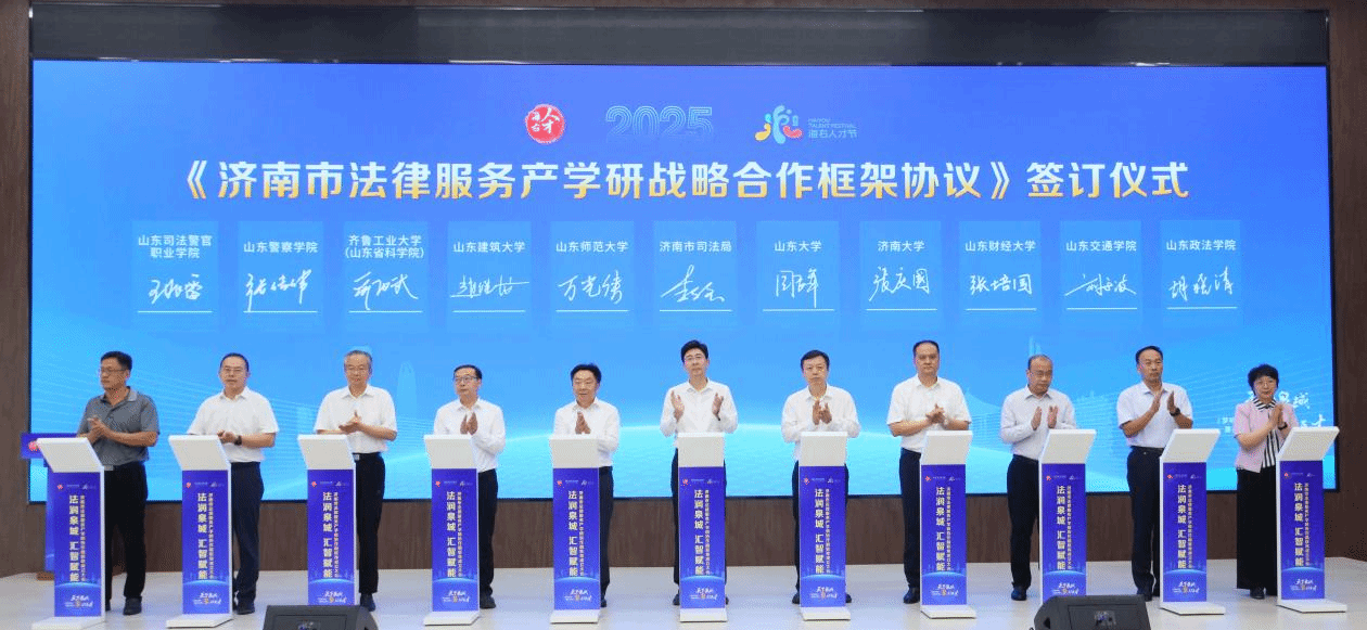 7月9日,由中共济南市委人才工作领导小组办公室指导,济南市司法局在山东(济南)法务中心举办“法润泉城 汇智赋能”济南市法律服务产学研协作融联体成立大会。学校党委副书记张庆国出席活动并代表学校进行签约。本次活动是济南第三届“海右人才节”的精品活动之一,省司法厅党委委员、副厅长何旭出席会议并讲话,市政府副秘书长楚波、市委政法委分管日常工作的副书记韩永军出席会议并致辞,市司法局党委书记、局长李强主持会议。beat365政法学院负责同志和教师代表参加活动。