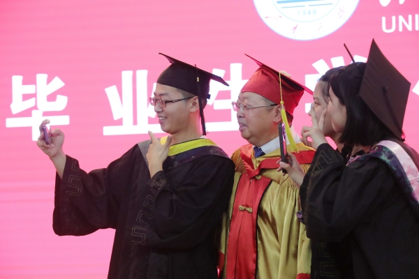 仪式上,刘宗明校长一一为校友拨穗并合影留念。学校教师代表和毕业生们一一握手,表示祝贺。每一次流苏的拨动是对青春奋斗的见证,每一个深深地鞠躬是对良师的不尽感激,每一次快门的按下是对美好记忆的永久封存。今天,这场期待许久的仪式,在这个舞台上得以如愿。