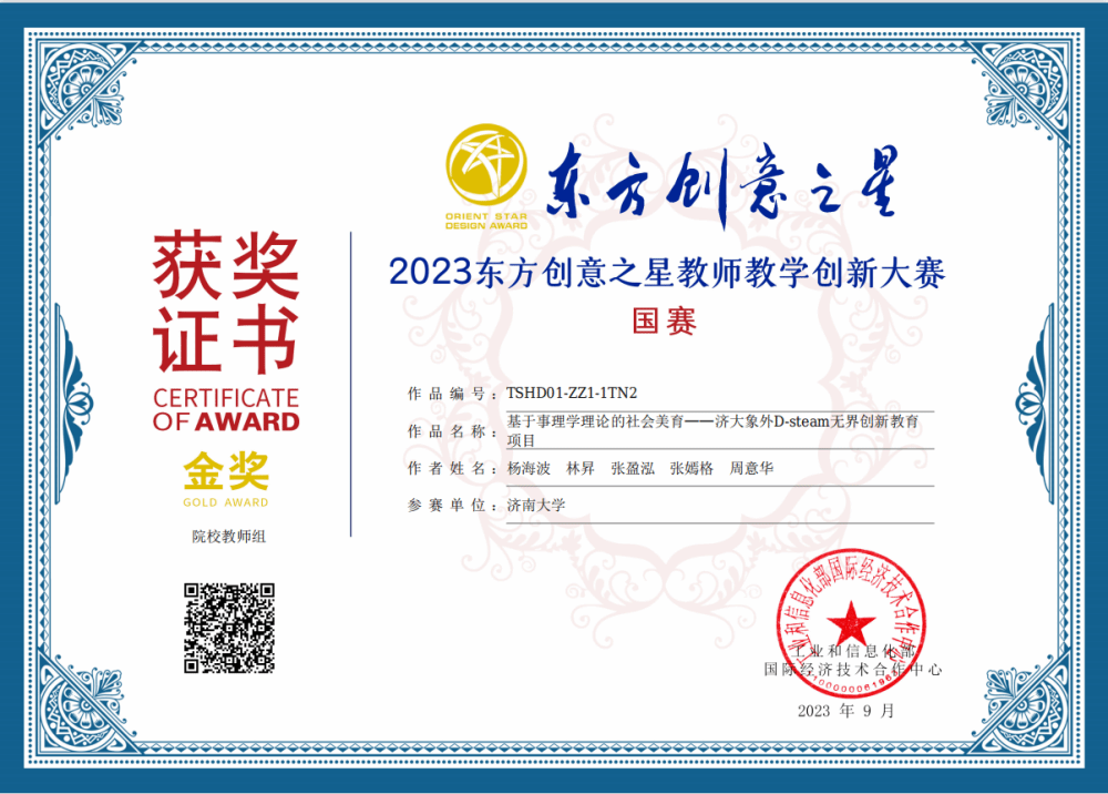 团队“基于事理学理论的社会美育——济大象外D-steam无界创新教育项目”,从中华传统文化中汲取思想精华,结合信息时代学习的特点,通过对国际"STEAM"课程的本土化改良创新,首创"D-STEAM"以设计(Design)引领科学(Science)技术(Technology)工程(Engineering)艺术(Arts)数学(Mathematics)多学科融合创新的通识教育体系。该体系专注于全生命周期创新思维开发和创新能力培养,培养受众用跨界无界思维进行系统的体验、感悟、分析、认知、表达和创造,最终综合提升个人创造能力和多元智能。