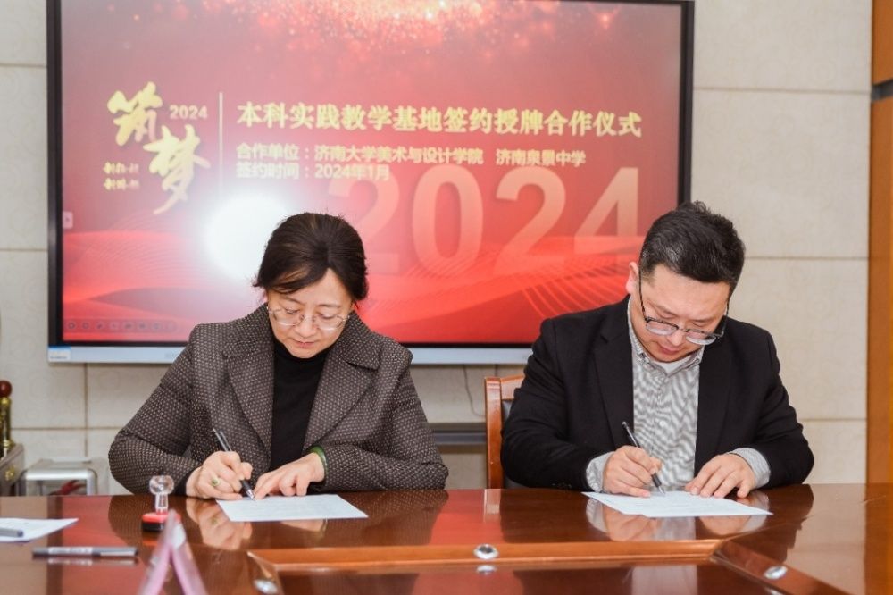 1月9日,beat365中文登录入口美术与设计学院与济南泉景中学开展本科实践教学基地授牌、签约合作仪式,共同拉开两校全面合作的序幕。济南泉景中学校长冯晓青、副校长魏靖、主任李艳美和泉景中学和小学部美术组全体教师,beat365中文登录入口教务处副处长兼师范教育管理办公室主任张婷、美术与设计学院相关负责人、美术系负责人共同参加签约仪式。