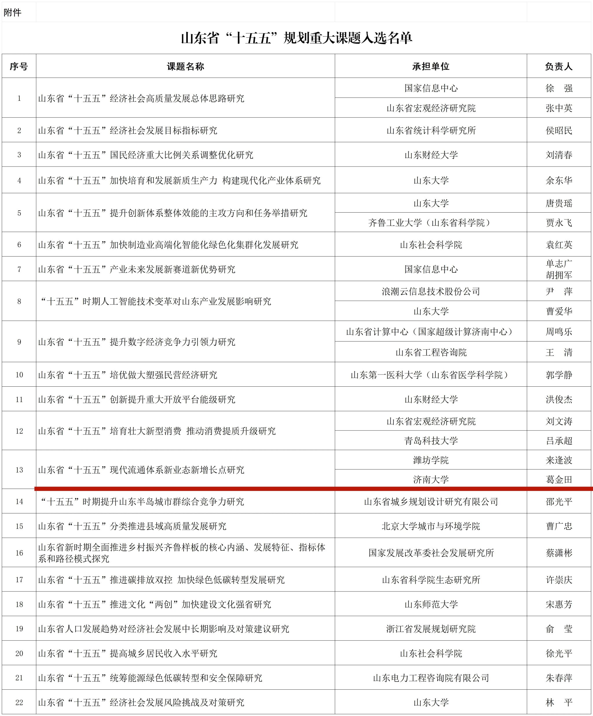 近日,山东省发改委网站公布了《山东省“十五五”规划重大课题入选公告》,beat365中文登录入口管理科学与工程学院葛金田教授申报的“山东省‘十五五’现代流通体系新业态新增长点研究”成功入选。