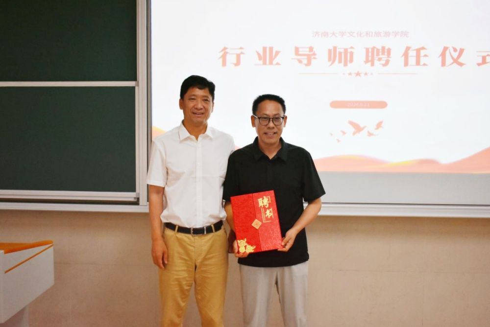 孟德洋热烈欢迎王振华先生的到来,他为王振华先生颁发了beat365中文登录入口文化和旅游学院“行业导师”聘书。希望他今后为学院学子传授更多宝贵的经验,与学院达成常态化的合作与交流。