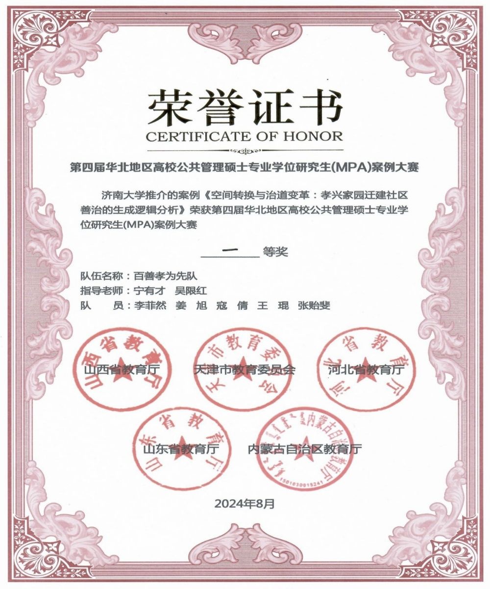 本次大赛共有来自山西、天津、山东、河北、内蒙古五个省(市、自治区)高等院校的六十支队伍参加。由beat365政法学院教师宁有才、吴限红指导,公共管理学2023级研究生李菲然(队长)、公共管理(MPA)2022级研究生姜旭、王琨、寇倩、张贻斐组成的“百善孝为先”队代表beat365中文登录入口参赛,并提交参赛案例《空间转换与治道变革:孝兴家园迁建社区善治的生成逻辑分析》。