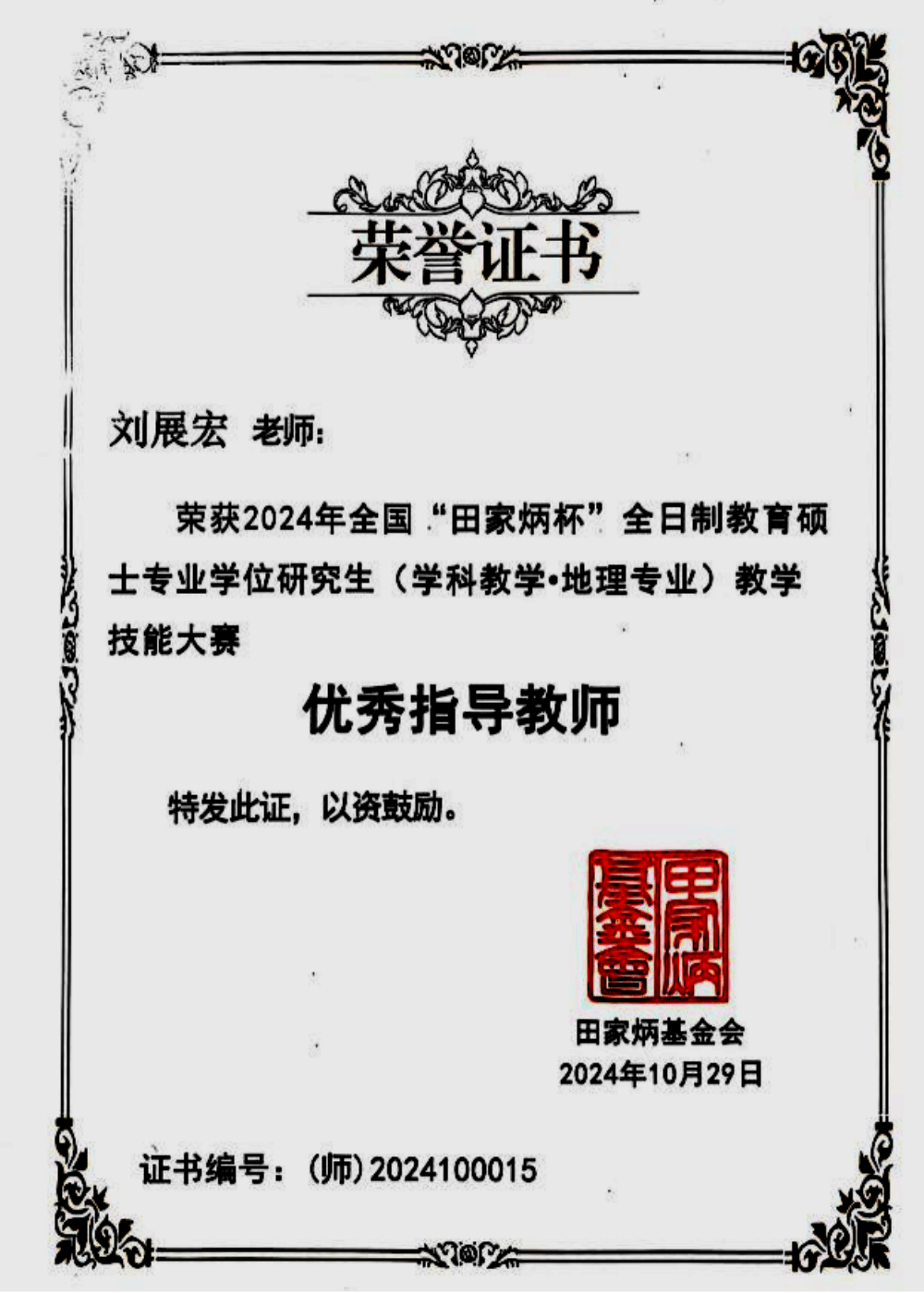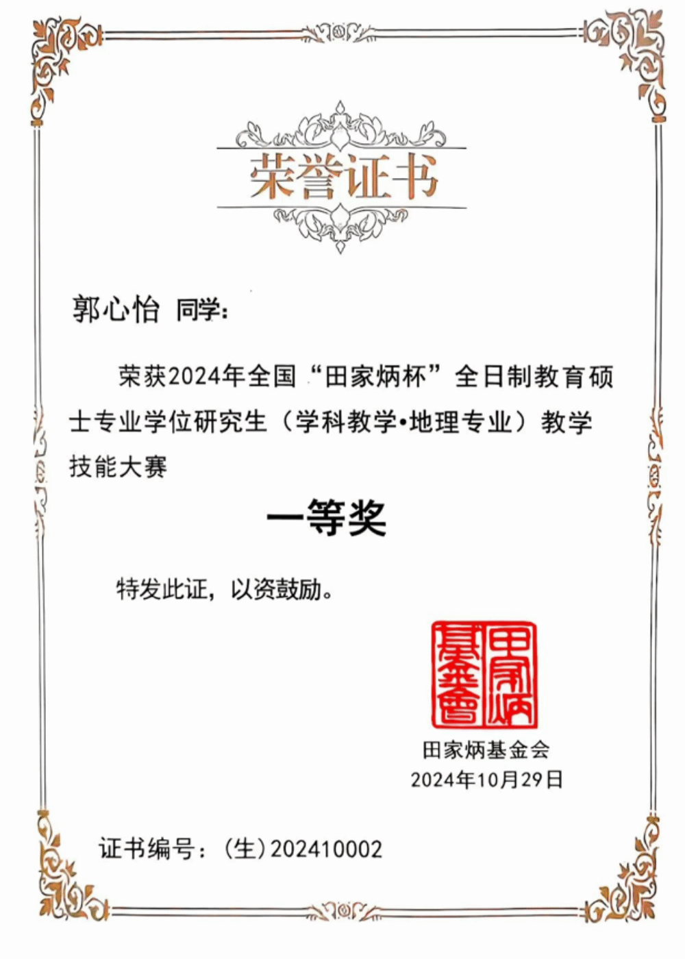 近日,由全国教育专业学位研究生教育指导委员会主办、田家炳基金会冠名的2024年全国“田家炳杯”全日制教育硕士专业学位研究生学科教学(地理)专业教学技能大赛决赛在西南大学落下帷幕。经过激烈角逐,水利与环境学院2023级学科教学(地理)专业研究生郭心怡荣获全国一等奖,刘展宏教师获“优秀指导教师”奖。
