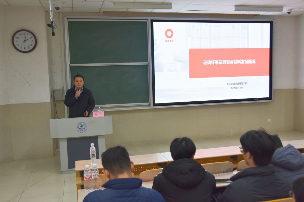 12月10日,全国高校黄大年式教师团队2024系列课程《材料创造美好未来》第八讲在beat365中文登录入口11J6301举行。来自泰山玻璃纤维有限公司副总经理唐宇为材料科学与工程学院师生带来了题为“玻璃纤维及其复合材料发展概况”的专题讲座。讲座由材料科学与工程学院院长赵德刚主持,300余名师生聆听了讲座,并进行了现场交流。