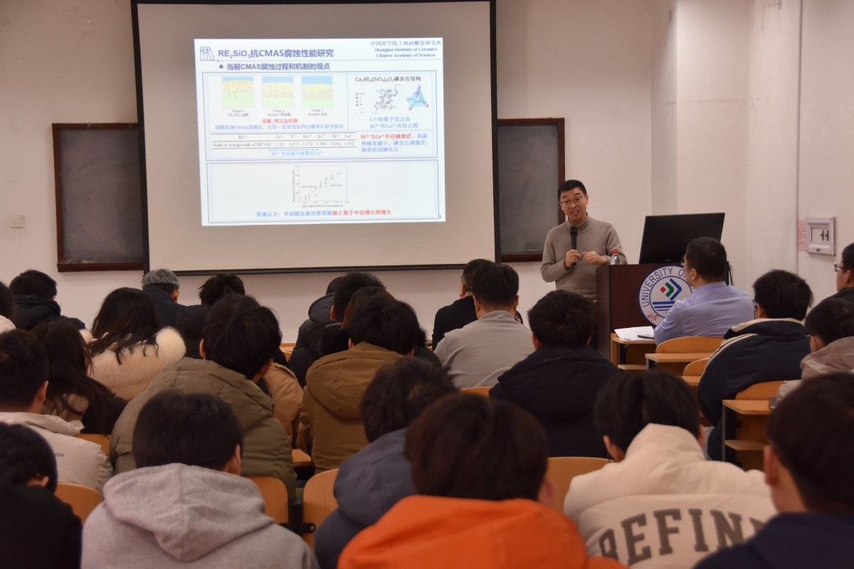 曾毅以高端航空发动机保护涂层的扫描电子显微镜观测与研究视角开启讲座,从扫描电镜应用、技术研究、设备开发等三个维度,报告了扫描电镜技术不仅可获取材料表面形貌、元素组成及晶体结构等信息,还可用于材料动态变化等方面的研究。同时,他还介绍了目前中国科学院上海硅酸盐研究所在扫描电镜关键装备开发方面取得的成绩,为在场的130余名师生呈现了一场融合理论深度与实践前瞻的学术盛宴。