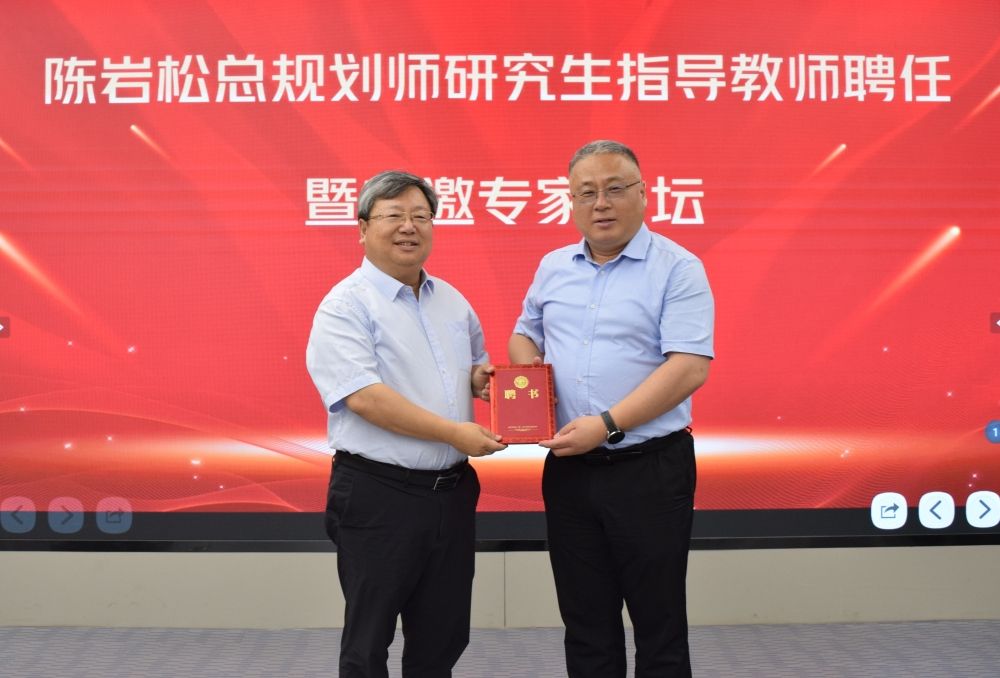 黄加栋代表学校致辞,感谢省自然资源厅对学校的关心和支持,介绍了学校最新发展情况,强调了深化产教融合、推进科技创新对学校高质量发展的重要意义,并为陈岩松颁发了城乡规划学硕士研究生指导教师聘书。