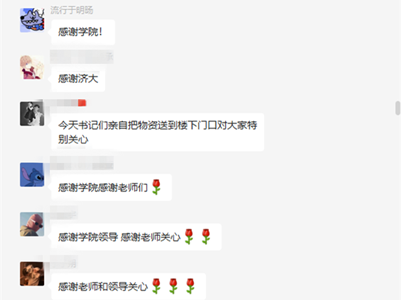 驻守在校内的志愿者们互相支持打气,身处校外的教职工也没有停下抗疫的脚步,他们时刻牵挂着在抗疫一线的同事和学生,送上悉心关爱,积极筹措物资,协调配合线上工作,守护好“大后方”,做好坚强后盾和保障工作。心手相牵,共克时艰!