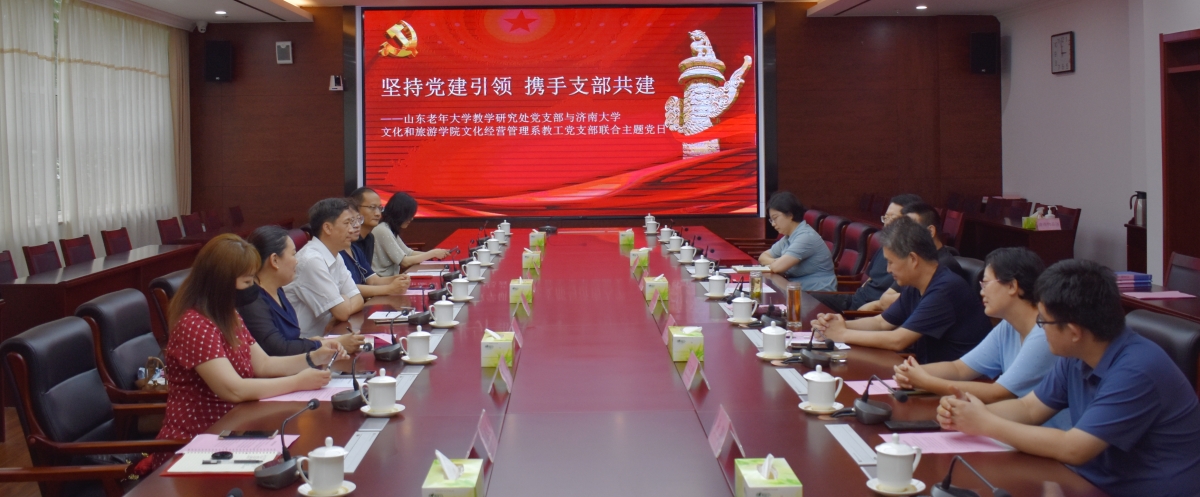 为庆祝建党102周年,深入学习贯彻党的二十大精神,推动学习贯彻习近平新时代中国特色社会主义思想主题教育走深走实,7月4日下午,beat365中文登录入口文化和旅游学院文管系党支部与山东老年大学教学研究处党支部联合开展了“坚持党建引领,携手支部共建”为主题的支部联建共建活动。山东老年大学副校长宋正宽,山东老年大学教学研究处、beat365中文登录入口文化和旅游学院相关负责人,双方党支部全体成员参加了活动。