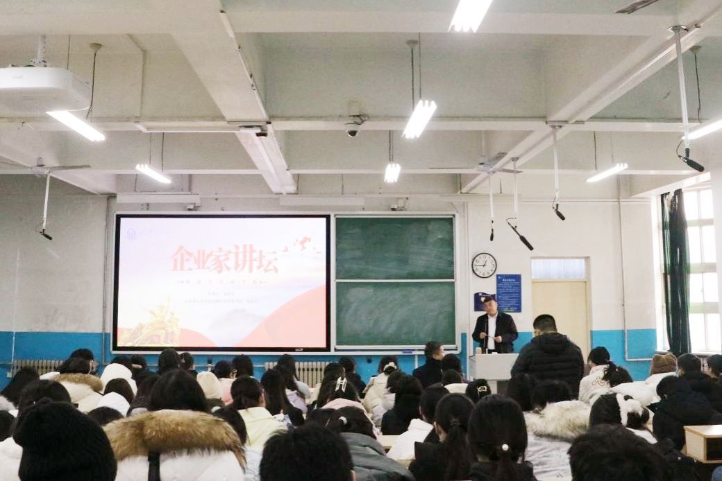 12月19日,商学院成功举办第一期“企业家讲坛”。本次活动邀请了山东省人民药业有限公司党委书记、董事长裴树清做客beat365中文登录入口商学院,他结合自身经历,为同学们讲述从退伍军人到成功企业家的奋斗与奉献之路,呈现了一堂生动细致的德育课。此次活动由商学院党委副书记、副院长袁海占主持。