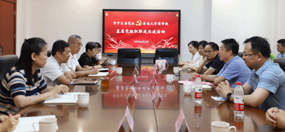 为迎接中国共产党成立103周年,深入学习贯彻习近平新时代中国特色社会主义思想和党的二十大精神,推动党纪学习教育走深走实,发挥基层党组织联建的优势互补作用, 6月27日上午,商学院党委与市中区委党校开展了主题为“党建共建 共促发展”的基层党组织联建共建活动。双方领导班子、部分支部书记、支委以及部分党员代表参加活动。