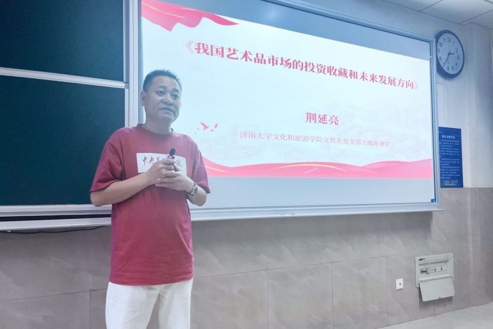 随后,荆延亮先生以其深厚的专业功底和丰富的实践经验,为在场师生带来了一场关于艺术品市场投资收藏与文化创意产业发展的精彩报告。他从自身亲历的艺术品拍卖讲起,逐步深入到艺术品价值、艺术品投资的风险与机遇以及未来发展方向等,用生动的案例和前沿的一手数据,为师生们勾勒出了一幅我国艺术品市场的面貌与未来发展蓝图。报告为在场师生展现了艺术品作为文化载体的独特价值以及其在推动文化产业发展繁荣中的重要作用。