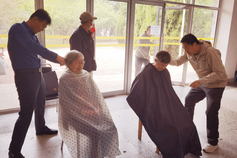 理发现场,理发师仔细询问老同志对于发型的要求,并根据其头型特点,为他们精心修剪发型。理发师娴熟地运用各项剪发工具,一边细心为老同志修剪头发,一边与他们唠着家常,现场氛围轻松愉快,耐心细致的服务也受到老同志们的一致好评。舜耕校区工作人员和志愿者亲自上阵,为老同志进行理发服务,受到老同志们的欢迎。