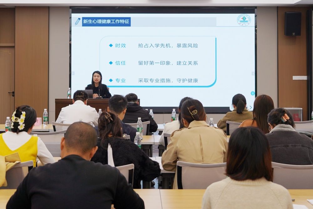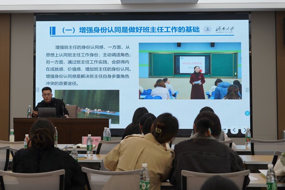 蔺琦琦作了题为《心理问题识别信号及途径》的报告,她从心理工作要点、日常工作开展、心理评估要点三个方面展开,通过报告让在场老师对于心理问题的觉察有了科学的方法、理性的看法,为老师们更好地开展学生心理健康教育提供了丰富、科学的指导。李海明作了题为《高校班主任在班级工作中的个人思考》的专题报告,他结合学生工作和班主任工作经验解析了班主任工作职责、框架和基本内容,强调担任班主任工作需要具备多方面的条件,包括身份认同、学生本位、强烈的责任感、思想政治引领能力、扎实的专业基础以及持续学习的态度,每个由不同学生凝聚而成的班风中都有老师的影子。最后,他强调:“引导学生成长是一项艰巨的任务。不仅要关注他们的学业成绩,更要关心他们的身心健康和全面发展。时常与学生谈心谈话,了解他们的困惑和需求,给予他们鼓励和支持。当看到学生们在自己的帮助下逐渐明确人生方向时,那种成就感难以言表。”