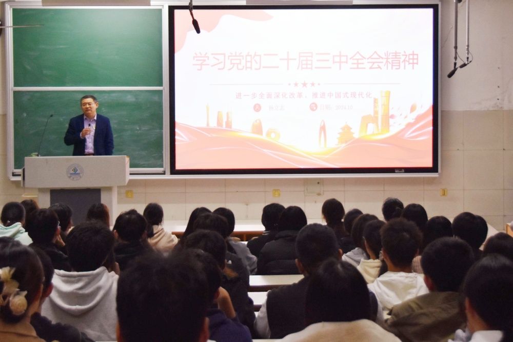 杨立志围绕党的二十届三中全会的核心要点,结合当前国内外形势,阐述了中国共产党在新时代的使命与担当。首先他深入讲解了党的二十届三中全会的背景,强调此次会议对于党和国家事业发展的重要性。随后讲解了全面深化改革的重大意义和总体要求,并进一步阐述了以经济体制改革为牵引,全面部署各领域、各方面的改革的重大举措。最后结合学院的实际,探讨了如何在新时代背景下,加强党的建设,推动学院各项事业高质量发展。