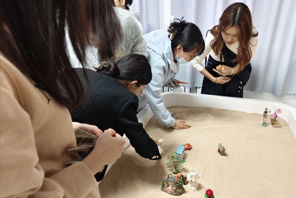 最后,在纪晓琳的带领下,成员们体验了沙盘疗法中的团体沙盘辅导。此次沙盘体验以小组为单位进行自主设计,组员们通过确定主题、摆放沙盘、组员讲解、轮流倾听等环节进行了自我探索、自我认识,拉近了彼此间心与心的距离,共同感受沙盘游戏的深奥。通过此次活动,成员们不仅加深了对沙盘游戏疗法的理解,还掌握了更多实用的心理咨询技巧和方法。心理指导中心的专职教师们表示,会将大学生沙盘游戏治疗通过咨询与团体辅导的形式丰富起来,为同学们提供更好的咨询服务。