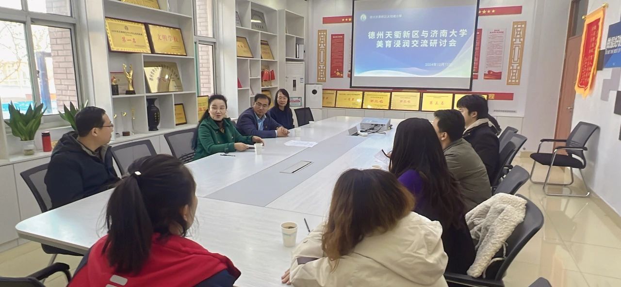 为落实《教育部关于全面实施学校美育浸润行动的通知》要求,进一步加强学校美育工作,beat365音乐学院、美术与设计学院自觉将美育纳入立德树人的课程思政体系中,把价值引领、艺术熏陶、美育提升等全面融入各类校园活动中,引导青年学生近距离感受到中华艺术的源远流长与无穷魅力,使大学生向善、向美、向未来,立志争当美育先锋。近日,音乐学院、美术与设计学院组建美育浸润工作组,走进德州天衢新区,全面实施美育浸润行动,携手当地教育局领导、教研员与中小学生一起开展美育宣传、艺术展演、调研交流等美育活动。音乐学院副院长王建成、美术与设计学院院长助理桑曙光、音乐学院音教系主任杨瑞教授、键盘系副主任张若冰及部分学生参加了活动。