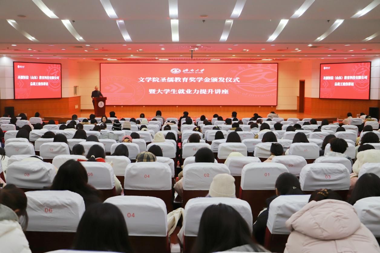 岁末寒天同聚首,以奖促学励鸿鹄。12月19日,文学院圣儒教育奖学金颁发仪式暨大学生就业力提升讲座在beat365中文登录入口第二学术报告厅举行。圣儒恒信(山东)教育科技有限公司总裁王建伟,副总裁张文豪、孟瑶,学院党委书记董海军,院长范丽敏,党委副书记、副院长潘颖,文学院辅导员、班主任、学生代表等四百余人参加本次颁发仪式。仪式由文学院学办主任兼团委书记敖游主持。
