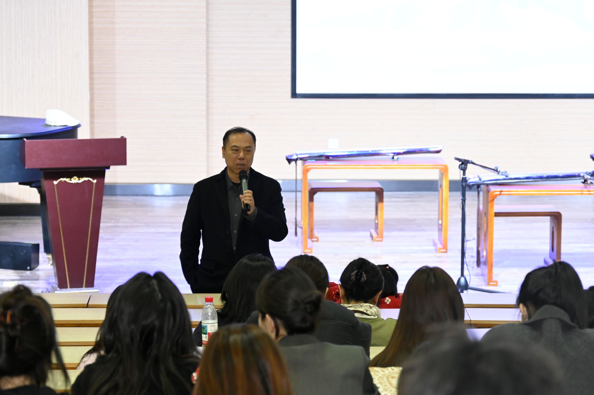 活动开始前,王建成教授致欢迎辞,详细解释了音乐学院举办齐鲁音乐文化讲坛的目的。他提到增强文化自信、传承中华文化的重要性,强调古琴作为传统乐器承载着深厚的历史文化,希望同学们加深对古琴艺术的理解,体验其艺术魅力,增强对传统文化的认同感和自豪感。