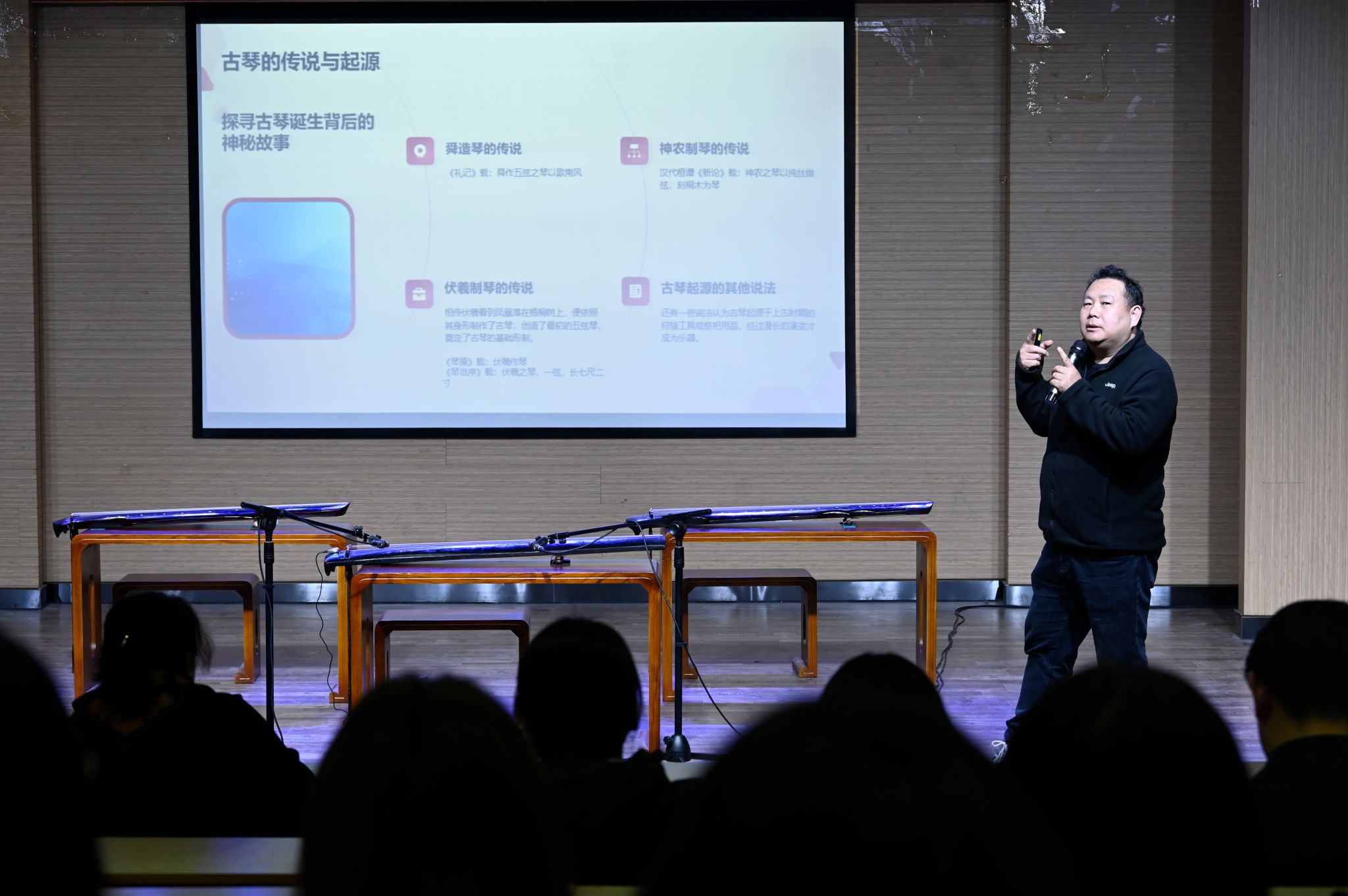 活动分为讲座阶段和演奏阶段,其中演奏阶段由李科师生共同精彩呈献。讲座阶段,李老师围绕“琴之源、琴之器、琴之谱、琴之韵、琴之意”几个方面展开,引导大家了解古琴的历史、构造、形制、指法和记谱方式,展示了学生制作古琴的过程,讲解了古琴的三种音色,探讨了古琴音乐的意境和文化内涵,并以《流水》为例进行解析。随后,李老师即兴邀请了现场的师生上台演奏,音乐学院教师张若冰及几位学生登台体验。