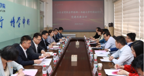 4月25日下午,外国语学院与山东省贸促会贸投部联合开展以“党建引领促发展,合作交流谱新篇”为主题的党建共建活动。本次活动由山东省贸促会党组成员、副会长贺忠军,省贸促会贸投部党支部书记、部长马家峰,组织委员、副部长徐勇等一行8人参加,外国语学院党政领导班子和大外第二党支部全体党员参加。