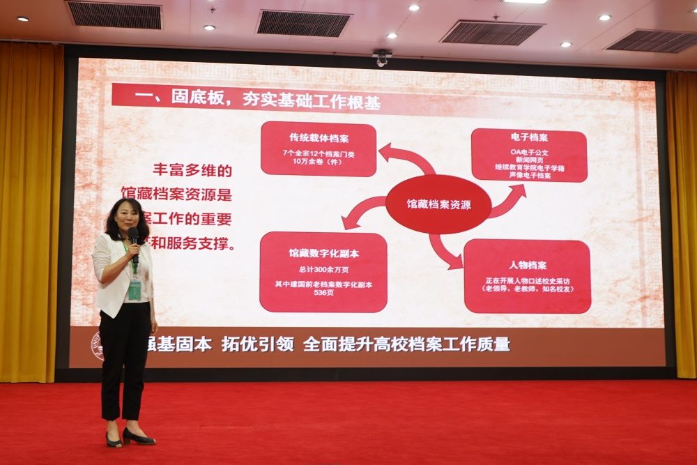 会议以“人工智能与数字转型:高校档案管理现代化与全域服务能力提升”为主题,安徽大学马仁杰教授、吉林大学张卫东教授作专家报告。省内6所高校围绕着高质量档案与校史工作实践、档案工作提质增效的实践探索等内容作经验交流发言。会上,董洁从固底板夯实基础工作根基、拓优势创新驱动特色发展、强引领党建赋能业务提质、重育人让档案“发好声、传强声、留余声”等四个方面分享了beat365档案馆(校史馆)的工作经验。她重点介绍了beat365档案治理体系、资源体系、利用体系、安全体系等“四个体系”建设情况,特别是在数智时代充分利用信息化手段全面提升档案工作质量的实践与探索。
