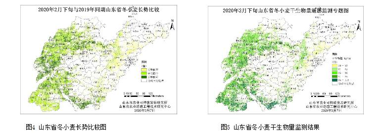 山东省是我国冬小麦主产区,为了及时为相关部门指导农业发展提供科学支撑,高分山东中心联合高分产业联盟单位——山东省农业可持续发展研究所(山东省农业遥感工程技术研究中心)开展了冬小麦遥感监测专题解译(见图4图5)。基于卫星遥感数据分析,2020年2月山东省小麦长势与2019年同期相比总体较好,其中济宁南部、聊城南部、德州北部、淄博北部趋势明显,分析结果对于指导我省冬小麦耕作将起到积极的促进作用。